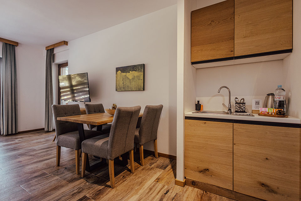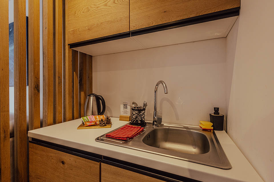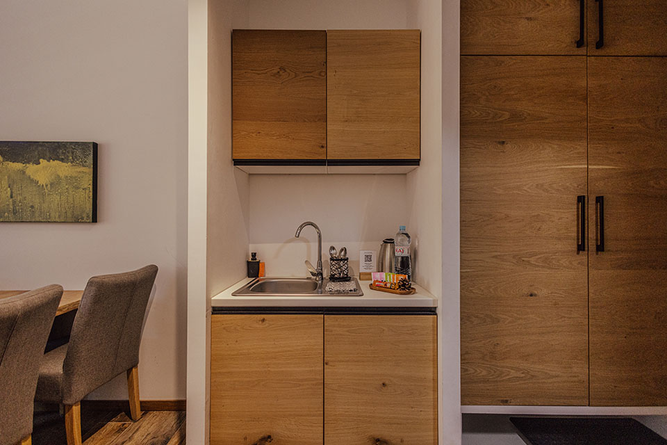 • Kitchenette: mini fridge, electric kettle, dining table with chairs